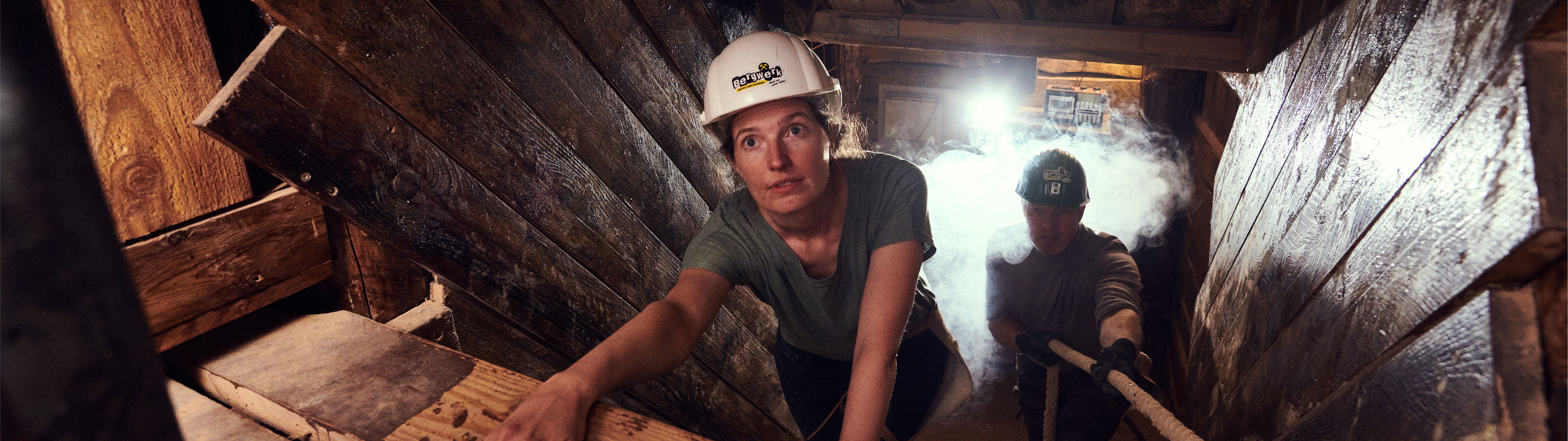 Junge Frau mit Helm klettert in einem Bergwerksstollen einen Anstieg hinauf